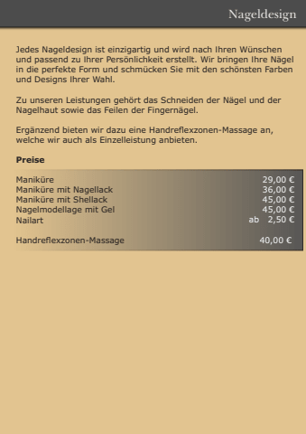Jedes Nageldesign ist einzigartig und wird nach hren W%u00fcnschen und passend zu hrer Pers%u00f6nlichkeit erstellt. Wir bringen hre N%u00e4gel in die perfekte Form und schm%u00fccken Sie mit den sch%u00f6nsten Farben und Designs hrer Wahl. Zu unseren Leistungen geh%u00f6rt das Schneiden der N%u00e4gel und der Nagelhaut sowie das Feilen der Fingern%u00e4gel. Erg%u00e4nzend bieten wir dazu eine Handreflexzonen-Massage an, welche wir auch als Einzelleistung anbieten.Preise Manik%u00fcre Manik%u00fcre mit Nagellack Manik%u00fcre mit Shellack Nagelmodellage mit Gel Nailart Handreflexzonen-Massage Nageldesign29,00 %u20ac 36,00 %u20ac 45,00 %u20ac 45,00 %u20acab 2,50 %u20ac 40,00 %u20ac